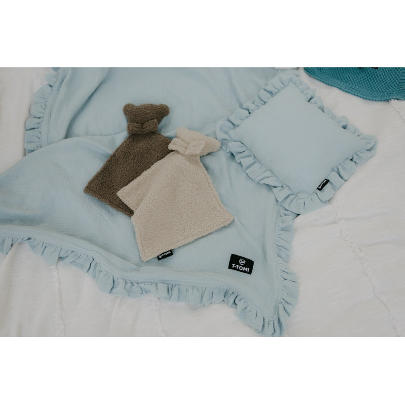 With combination of our muslin blanket with T-TOMI Muslin pillow with ruffles you will make one perfect cozy bed.